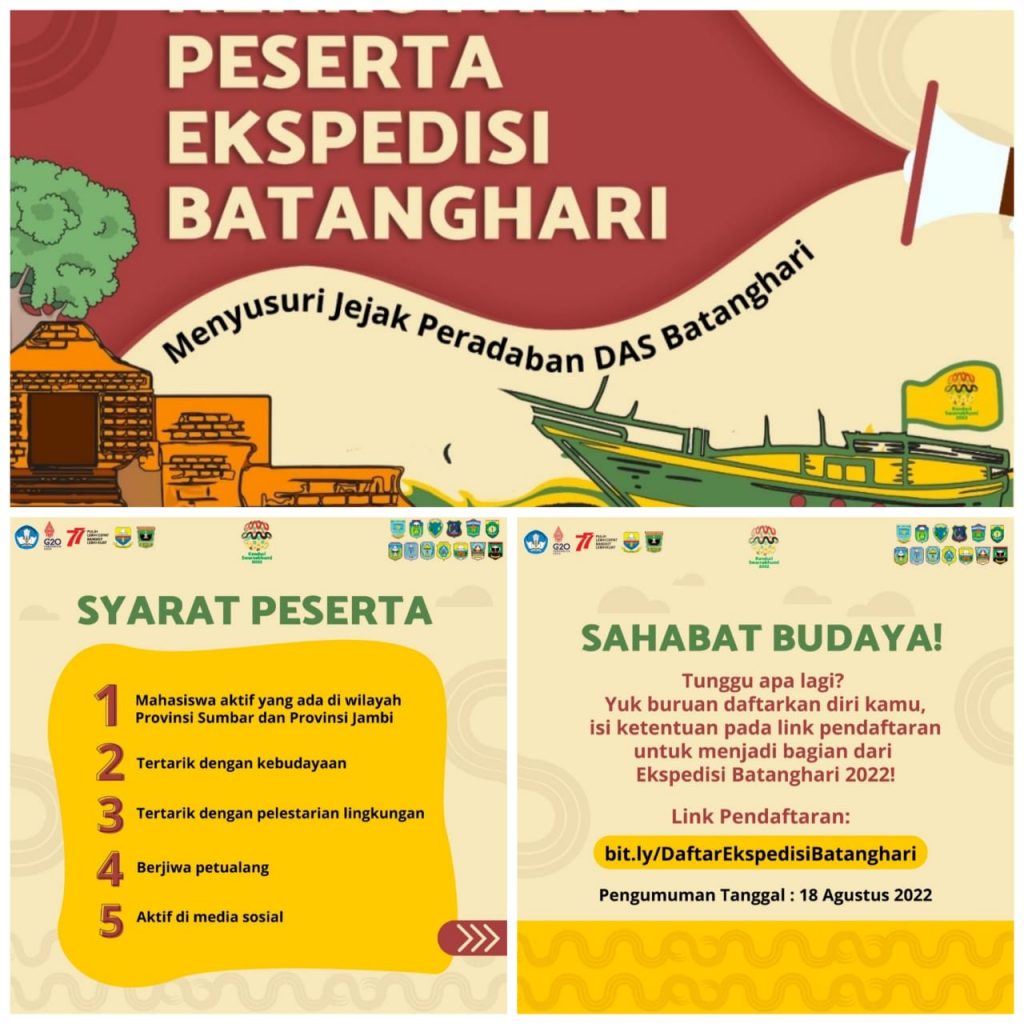 Ayo…. yang merasa dirinya Mahasiswa dan memenuhi kriteria persyaratan diatas, silahkan diikuti kegiatan “PESERTA EKSPEDISI BATANGHARI” Menyusuri Jejak Peradaban DAS Batanghari dengan cara klik link pendaftaran diatas dan lihat pengumumannya di tanggal 18 Agustus 2022.
